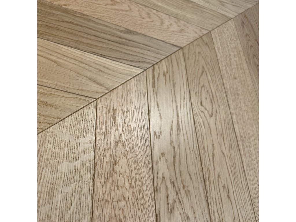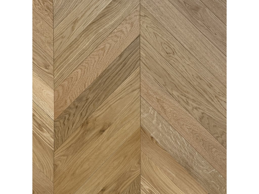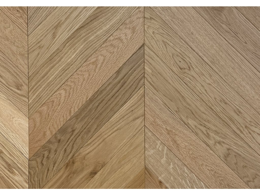 AKCIA Drevené parkety CHEVRON DUB Prírodný, Select AB, Lak, Kartáč, 2-vrstvové, mikro4V špára 14x90x510mm - chevron