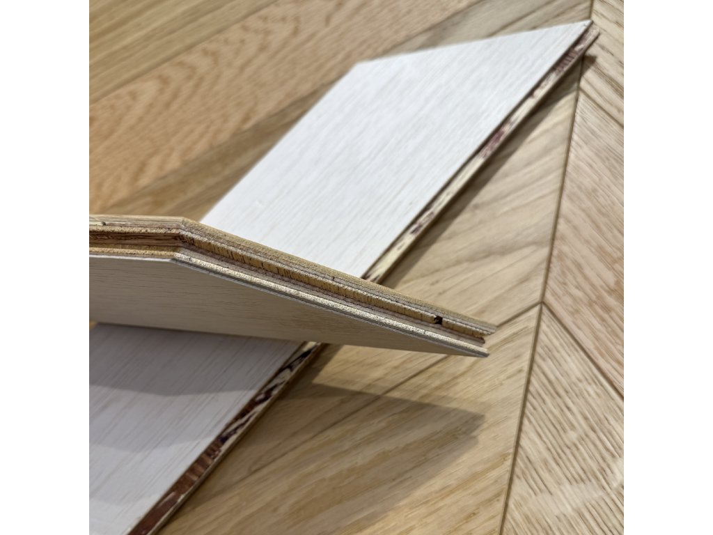 Drevené parkety Chevron v 2 - vrstvovom prevedení určené na celoplošné lepenie. Nášlapná vrstva Dubového dreva o hrúbke 3mm. Povrch je kartáčovaný a matne lakovaný. Tento typ parkiet je vhodný aj do komerčné priestoru so vstupom napríklad aj priamo z ulice. Pre domáce použitie má táto parketa takmer neobmedzenú životnosť. Po pokládke parkiet už nieje nutné ich nijako povrchovo opracovať, po položení je možné podlahu úžívať po vyschnutí lepidla.