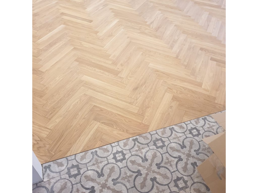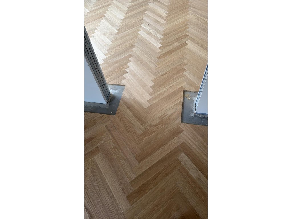 Drevená podlaha Dub Select (Trieda I.) Herringbone 11 x 70 x 490 mm, Olej/Lak, Dubový nášlap 3,5mm - Rybia kosť