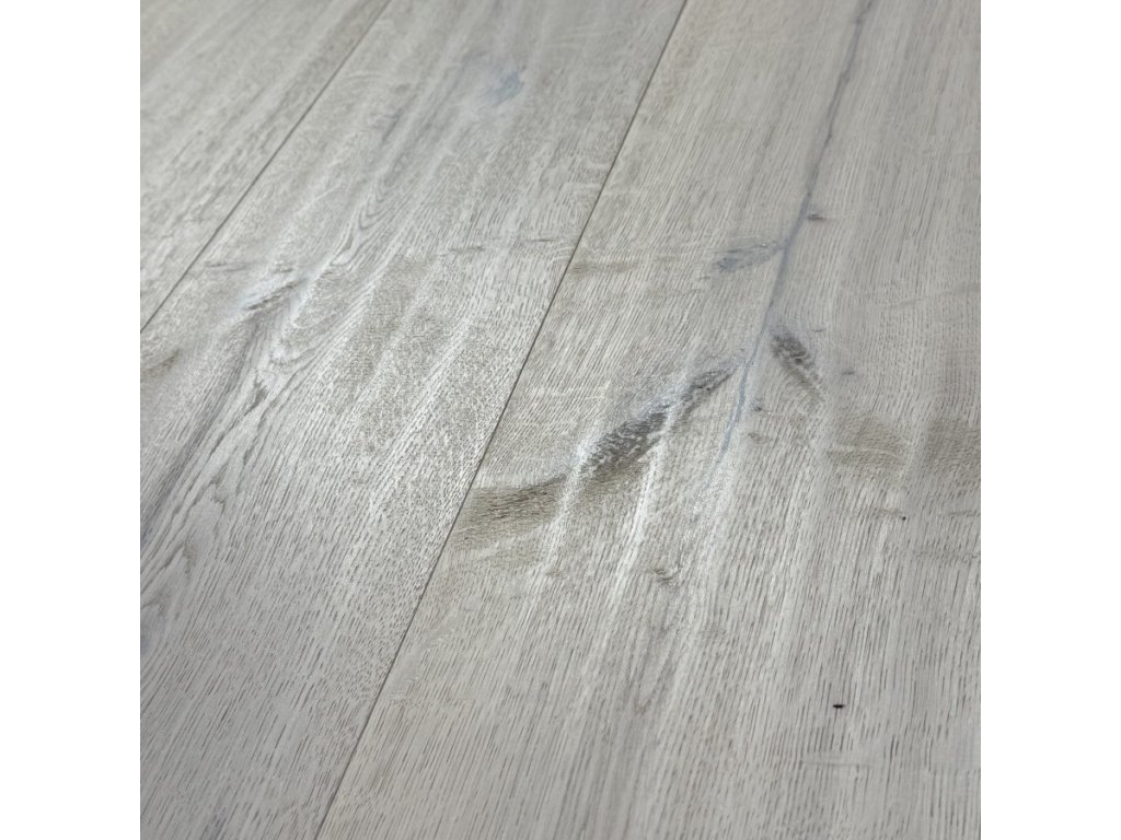 Vrchová vrstva je kartáčovaná a následne upravená ručným hoblíkom, ktorý vytvára jemné vlny na povrchu. Táto štruktúra dodáva podlahe jedinečný 3D efekt, príjemný na dotyk aj na pohľad. Povrchová úprava bielym olejomzanecháva na dube ľahký, prirodzený biely závoj, ktorý zjemňuje teplý odtieň dubu a posúva ho do modernejšieho, svetlejšieho a opticky vzdušnejšieho tónu. Zároveň drevo chráni pred bežným zaťažením v interiéri a olejovaný povrch je možné lokálne opravovať, čo predlžuje životnosť podlahy.